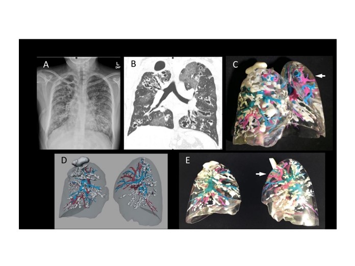 In der Publikation der Arbeitsgruppe von Mirza berichtet ein Kooperationsteam von Pneumologen, 3D-Druck-Spezialisten und Radiologen vom Einsatz des 3D-Drucks, um bei einem jungen Erwachsenen mit fortgeschrittener CF ein transparentes Lungenmodell mittels eines CT-Scans zu entwerfen. Das Modell wurde mit einem Materialstrahlverfahren gedruckt, eine Technologie, bei der dünne Schichten von flüssigem Kunststoffpolymer mit 3D-Druck-Mikronadeln aufgetragen werden, die dann mit UV-Licht gehärtet und in Schichten sukzessive aufgebaut werden, um ein dreidimensionales Modell (Abbildung 1) zu errichten. In diesem Lungenmodell wurden die Lungenarterien, die sauerstoffarmes Blut zur Lunge transportieren, blau abgebildet (der gewöhnliche Standard für sauerstoffarmes Blut), die Lungenvenen, die sauerstoffreiches Blut zurück zum Herzen transportieren, wurden rot abgebildet, die Atemwege weiß und andere Atemwegsgewebe durchsichtig. Der transparente Charakter dieses Modells zeigt eindeutig die anormalen Atemwege und deren Zusammenhang mit den Lungenblutgefäßen bei diesem CF-Patienten. Das Modell zeigt stark geweitete gerundete Stellen von Bronchiektasen (auch bekannt als zystische Bronchiektasen) im rechten Hauptlappen des Patienten, welcher eine Ansammlung von Pilzinfektionen aufweist.