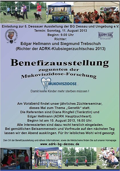 Am Sonntag, den 11. August findet die 5. Dessauer Hundeausstellung zugunsten mukoviszidosekranker Menschen statt. Die Veranstaltung startet um 8 Uhr im Sportpark SG Blau Weiß Dessau e.V. Der Innenminister Sachsen-Anhalts, Holger Stahlknecht, ist Schirmherr der Ausstellung. Weitere Informationen erhalten Sie beim 1. Vorsitzenden des ADRK BG Dessau und Umgebung, Daniel Kemp: kontakt@adr-bg-dessau.de Alle Interessierten sind herzlich eingeladen!