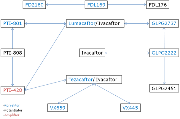 Galapagos NV setzt dabei auf eine Kombination von frühen und späten Korrektoren mit einem Potentiator so Katja Conrath in ihrem Vortrag. Die so genannte FALCON-Studie, eine open-label Studie mit der ersten Galapagos-Dreifachkombination, läuft gerade. Erste Ergebnisse werden für Ende des Jahres erwartet. Ob sich die Wirkung des Potentiators Ivacaftor bei den seltenen Gating-Mutationen (z.B. G551D) weiter verbessern lässt, untersuchte Galapagos NV in der ALBATROSS-Studie: Der Chloridwert im Schweiß konnte durch die zusätzliche Einnahme von GLPG2222 weiter deutlich reduziert werden; ein klarer Effekt auf die Lungenfunktion ergab sich in der Studie jedoch noch nicht. Der späte Korrektor GLPG2737 wird bei Patienten mit zwei F508del-Mutationen in Kombination mit Lumacaftor/Ivacaftor in der so genannten PELICAN-Studie untersucht. Erste Daten hierzu sollen in Kürze veröffentlicht werden. Galapagos gab inzwischen bekannt, dass die PELICAN-Studie keine signifikante Verbesserung der Lungenfunktion bei Kombination von GLPG2737 mit Lumacaftor/Ivacaftor zeigen konnte. Laut Conrath untersucht Galapagos NV derzeit die beiden Potentiatoren GLPG2451 und GLPG3067 sowie die frühen Korrektoren GLPG2222 und GLPG2851 und die späten Korrektoren GLPG2737 und GLPG3748.