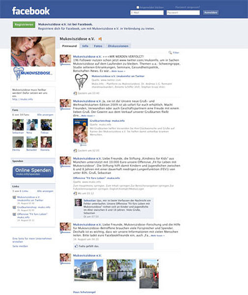 Alle diejenigen, die bereits ein Facebook-Konto haben, sind eingeladen "Fan" des Mukoviszidose e.V. zu werden. Ihnen werden dann regelmäßig automatisch die neusten Informationen aus Verein und Forschung angezeigt. Außerdem können registrierte Besucher selbst eine Nachricht auf der Pinnwand des Vereins posten und mit anderen Interessenten in Kontakt treten. Wir freuen uns auf eine rege Beteiligung.