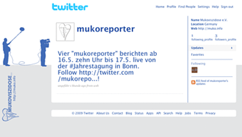 In diesem Jahr bietet der Mukoviszidose e.V. in Zusammenarbeit mit vier Betroffenen einen neuen Service an: Über die Microblogging-Plattform twitter werden Katrin R., Stephan K., Miriam S. und Kathrin B. unter dem Namen mukoreporter abwechselnd ihre Eindrücke von der Jahrestagung vom 16. bis zum 17. Mai 2009 in Bonn übermitteln.