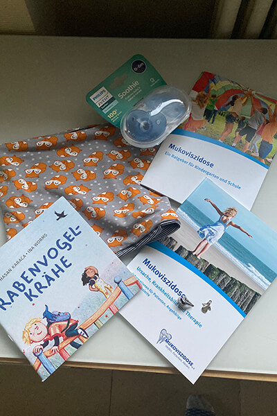 Jede Hope Bag enthält nützliches Informationsmaterial, ein Bilderbuch, Selbstgemachtes und ein persönliches Anschreiben, das die Eltern in der Welt der Mukoviszidose willkommen heißt und Unterstützung anbietet. Diese Geste des Willkommens schenkt den Eltern Mut und Kraft.
