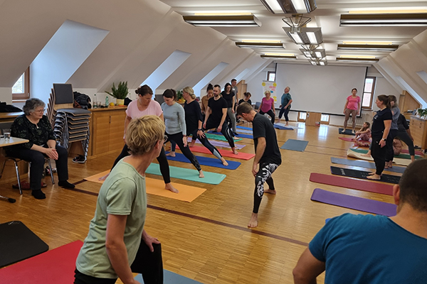 Budokan, ein ganzheitliches Bewegungssystem, das Yoga, Mobility und Martial Arts vereint, war den meisten von uns völlig neu und wir unterschätzten ein bisschen, wie anstrengend es sein wird. Unser Coach Stefan Riegel verstand es aber bestens, kompliziert aussehende Übungen mit uns einzuüben und so hatten wir einen Schweiß treibenden, aberausgelassenen Vormittag.