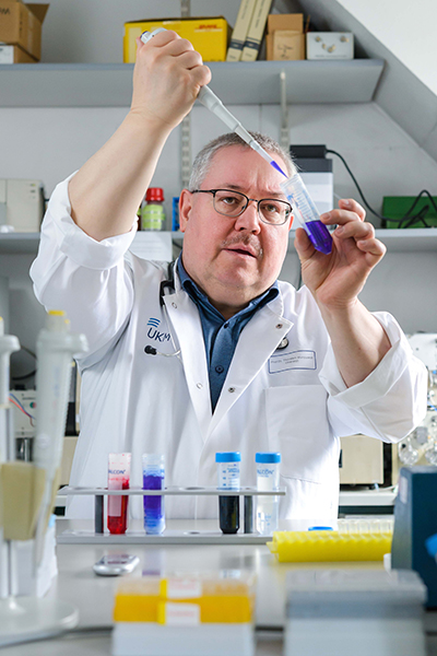 Der in Münster entwickelte Therapieansatz beruht in erster Linie auf der Annahme, dass die Blockade eines weiteren Chloridkanals (TMEM16A) zur Verringerung der Schleimproduktion bei Mukoviszidose-Patienten führen könnte. Bei der Entwicklung dieser Arbeitshypothese kam den Münsteraner Ärzten, wie so oft, der Zufall zur Hilfe, wie Thorsten Marquardt erläutert: „Eltern stellten ein wenige Monate altes Mädchen mit einer Gedeihstörung und Bauchproblemen vor, das leider in der Folge verstarb. Wir entdeckten bei ihr und ihrem älteren Bruder eine bis dato unbekannte neue Erkrankung, die zu einem Verlust der TMEM16A-Funktion führte. Die Überraschung: Der Verlust von TMEM16A führte auch zu einem Verlust der CFTR-Funktion – ohne jedoch, dass zu diesem Zeitpunkt Symptome der Mukoviszidose auftraten. Da wurden wir natürlich hellhörig – schließlich erlebten wir nicht zum ersten Mal, dass die Neudiagnose einer Seltenen Erkrankung hilft, eine andere besser zu verstehen.“