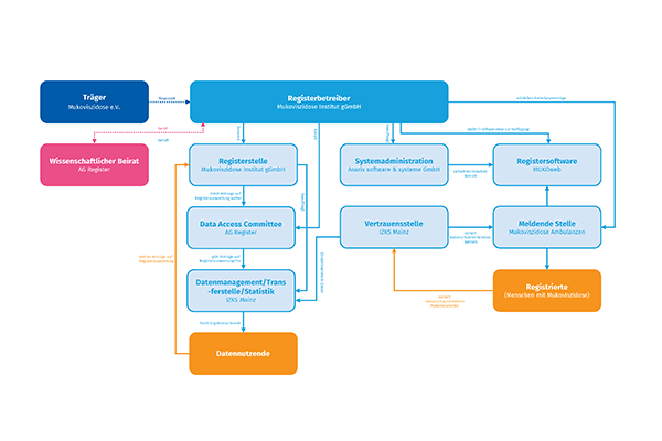 Die Mukoviszidose Institut gGmbH (gemeinnützige Gesellschaft für Forschung und Therapieentwicklung mbH – MI) wurde durch den Mukoviszidose e.V. mit der Planung und Koordination des Deutschen Mukoviszidose-Registers beauftragt. Sie tritt gegenüber den beteiligten Mukoviszidose- Einrichtungen, den Patienten und den unterbeauftragten Dienstleistern als verantwortliche Stelle (Registerbetreiber) auf. Als verantwortliche Stelle wird im Sinne des Art. 4 Datenschutzgrundverordnung (DSGVO) die Stelle bezeichnet, die allein oder gemeinsam mit anderen über die Zwecke und Mittel der Verarbeitung von personenbezogenen Daten entscheidet.
